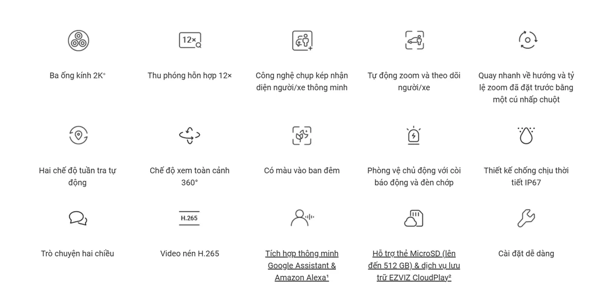 | Lưu trữ đám mây | Hỗ trợ lưu trữ EZVIZ CloudPlay (yêu cầu đăng ký) |