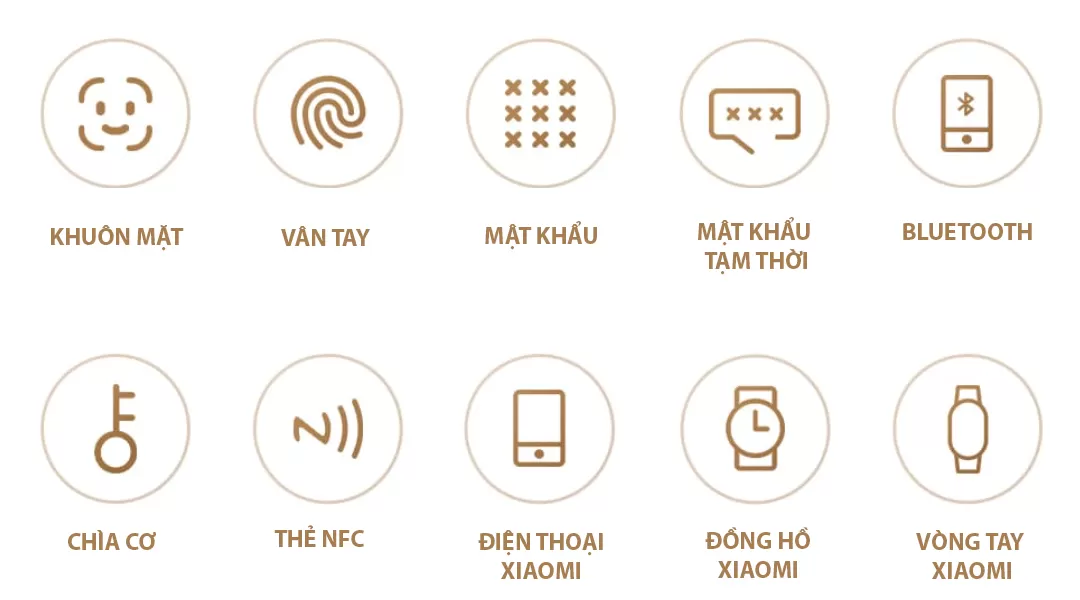 - Cách mở cửa : nhận diện khuôn mặt, vân tay, mật mã, mật mã tạm thời, Bluetooth, thẻ từ NFC ( mua thêm) ,điện thoại xiaomi, đồng hồ xiaomi, vòng đeo tay xiaomi.