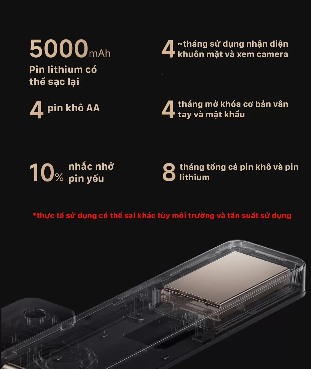 Đặc biệt, khóa cửa thông minh này được trang bị pin sạc 5000mAh kèm theo 4 pin AA, cho tổng thời gian sử dụng lên đến khoảng 8 tháng, giúp bạn an tâm sử dụng mà không lo lắng về vấn đề pin. ( Pin sạc 5000mAh sử dụng cho hệ thống chuông cửa và bắt wifi nên có thể nhanh hết, pin AA sử dụng cho hệ thống vân tay ).