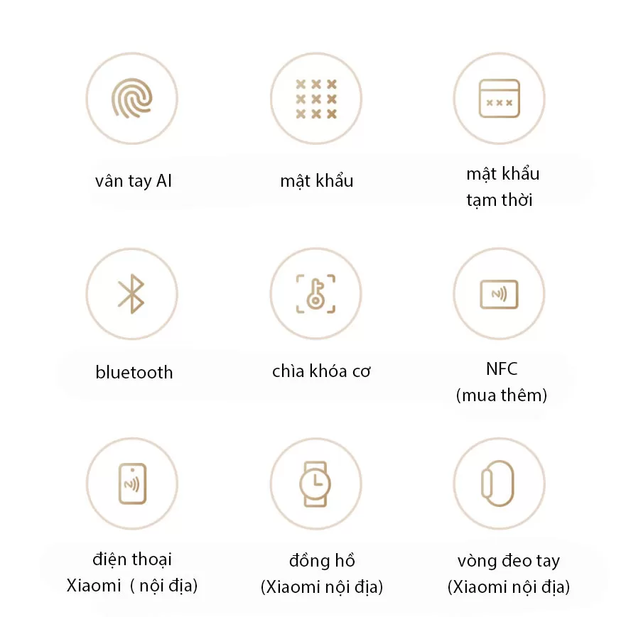 Khóa cửa thông minh E30 có tổng cộng 9 phương pháp mở khóa. Bao gồm nhận dạng vân tay hỗ trợ AI, mật khẩu dài hạn, mật khẩu một lần/thời hạn, mở khóa Bluetooth trên điện thoại di động, chìa khóa cơ khẩn cấp, Thẻ cửa NFC của Khóa cửa thông minh Xiaomi (cần mua riêng), điện thoại thông minh Xiaomi, đồng hồ thông minh Xiaomi và vòng đeo tay thông minh Xiaomi .