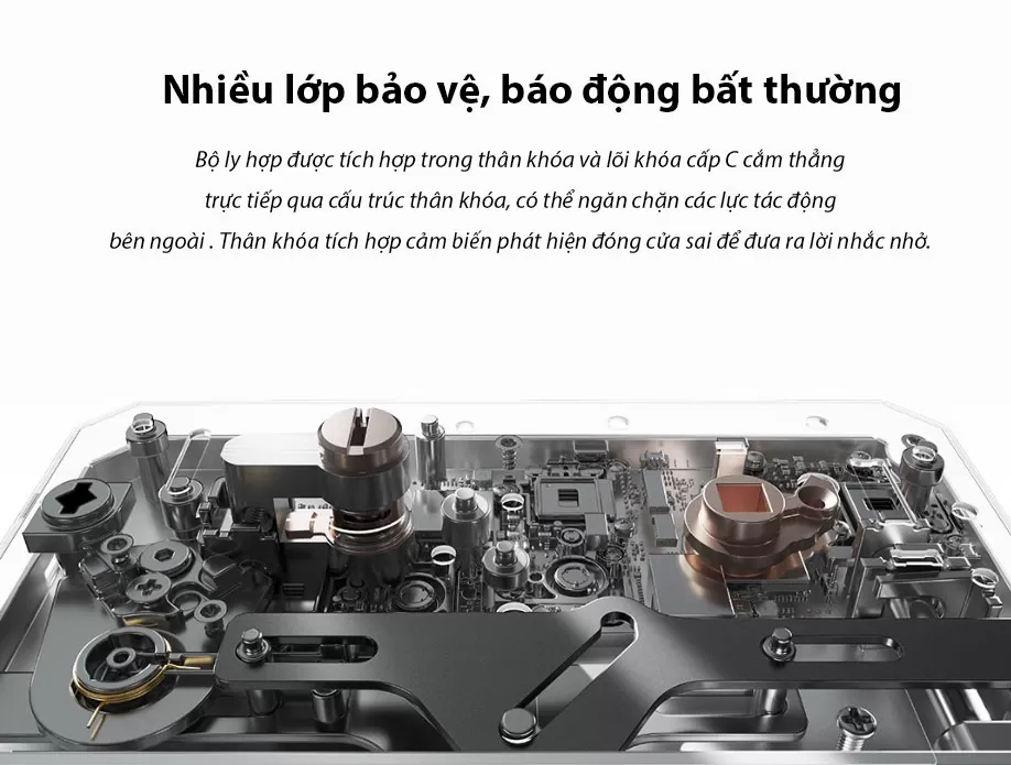 Sử dụng một Xi lanh khóa cấp C chèn trực tiếp, đi qua toàn bộ cấu trúc của khóa, khiến việc mở cửa trở nên khó khăn hơn ngay cả khi tấm bên ngoài được tháo ra bằng lực. Hơn nữa, thân khóa tích hợp bộ ly hợp và cảm biến phát hiện nửa mở, phát ra cảnh báo trong trường hợp cố gắng mở một phần cửa, đảm bảo bảo vệ bổ sung chống lại các nỗ lực đột nhập.