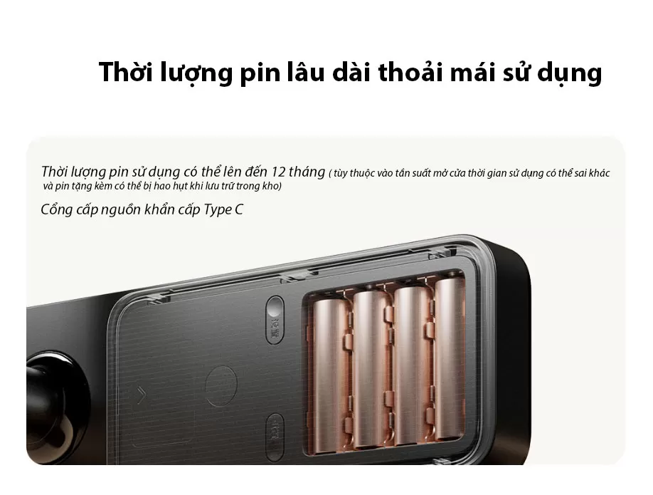 Thời gian sử dụng pin có thể kéo dài đến 12 tháng, tùy thuộc vào tần suất mở cửa. Tuy nhiên, lưu ý rằng pin tặng kèm có thể hao hụt trong quá trình lưu trữ.Khi hết pin, bạn có thể kết nối sạc dự phòng bên ngoài qua Type-C để cung cấp nguồn điện khẩn cấp. Điều này đảm bảo rằng khóa vẫn hoạt động ngay cả trong những tình huống khẩn cấp.