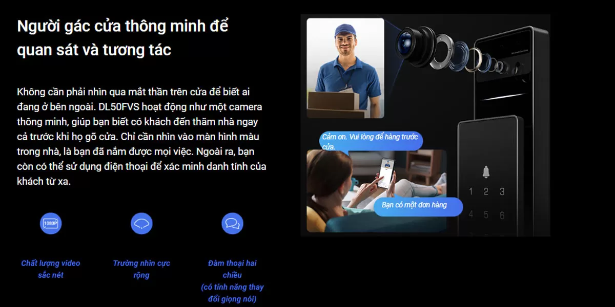 | Tính năng thông minh | Cuộc gọi video hai chiều, Chế độ xem cửa (Mắt thần điện tử) |