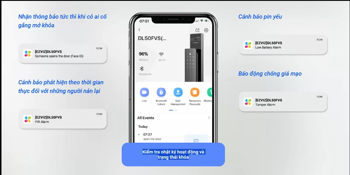 | Quản lý từ xa | Qua ứng dụng EZVIZ (Kiểm tra lịch sử, tạo mã, nhận cảnh báo) |