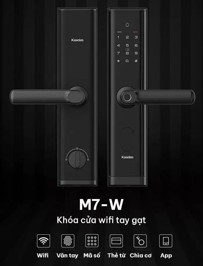 Khóa Kaadas M7-W hỗ trợ nhiều phương thức mở khóa hiện đại, bao gồm vân tay, mã số, thẻ từ, chìa khóa cơ, và điều khiển qua ứng dụng.